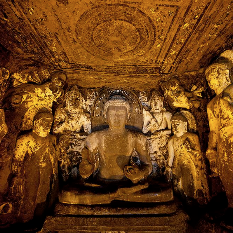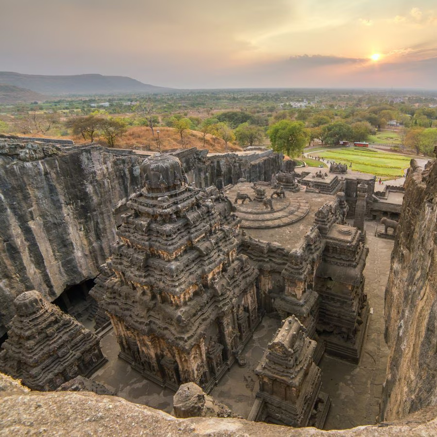 The Ellora Caves are a UNESCO World Heritage Site in India, featuring a complex of 34 rock-cut temples and monasteries dedicated to Buddhism, Hinduism, and Jainism. These caves, carved into the Charanandri hills, showcase intricate sculptures, detailed frescoes, and monolithic shrines, reflecting the artistic and spiritual ingenuity of ancient India. The caves are renowned for the Kailasa Temple, a massive structure carved from a single rock, and are a testament to religious tolerance during their construction period.